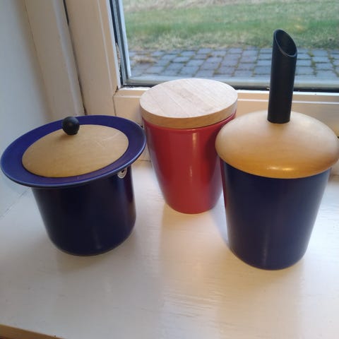 Jeg selger en stelton sukkerkopp, to fløtemugger og en liten skål. Blank plast, sorte matte lokk. Merket Stelton, design Erik Magnussen. Made in Denmark.