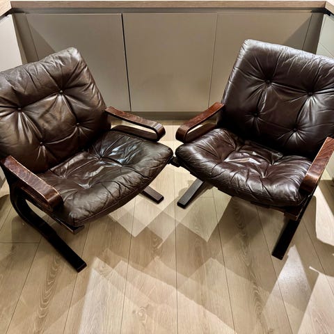 2 stk teak stol med mørkeblått Teddystoff. Trekkene er fine uten flekker eller hull. Treverket er veldig litt slitt, valgt og ikke gjøre noe med det, da de ser fine ut. Originale stoler som mine besteforeldre hadde i finstua si.