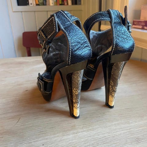 Høye heler fra Jason Wu lagd i Italia. Ekte slangeskinn og skinn, str. 37. Blå/grønne med svart. Hel høyde ca. 14cm.