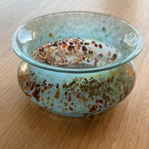 Skåler / boller i glass med prikker / polka dot mønster på blå bakgrunn.