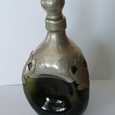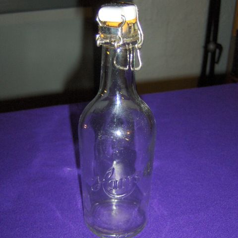 Den måler 29,5 cm i høyden og har poselenskork fra Halstahammars Bryggeri. Har inneholdt 'Vinsockerdricka', og er klar for flere nye og skjønne saftblanninger på sommerbordet.