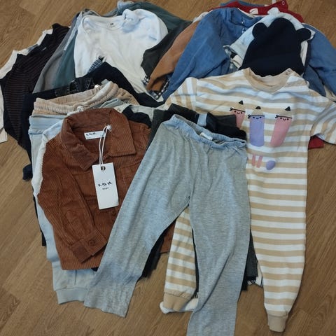 Alle buksene er i str 86 +hvite genseren. Resten er i 80, men kan også passe 86. Hele og uten flekker, bortsett fra den ene buksa, se bilde. Kan hende enkelte trenger en vask.