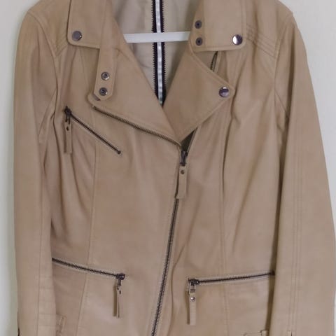 2 Biz jakke mørk beige, kort modell. Er ikke skrukkete, skal være litt røff