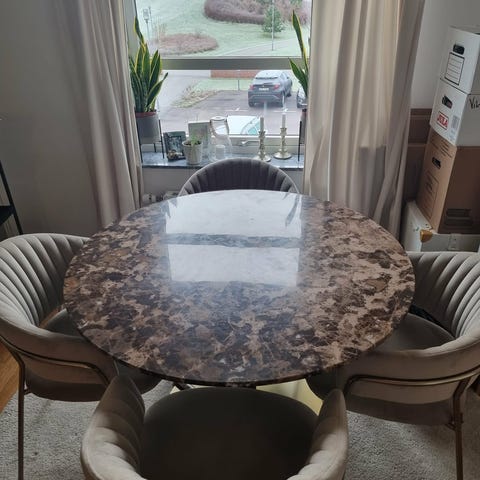 Marmor er et vakkert og tidløst naturmateriale som aldri går av moten. Med vårt Berg rundt spisebord i hvit marmor vil spiseområdet ditt bli til en samlingsplass preget av vakre detaljer og kvalitetsrikt design. Marmorens natur gjør at hver bordplate får et helt eget og unikt utseende, og med en base av hvit metall, blir Berg spisebord elementet som gir spisestuen din et stilrikt uttrykk med noe av det beste naturen har å by på.