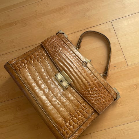 En unik vintage veske som har vært godt oppbevart gjennom årene. Denne arvet jeg fra min mor og er kjøpt tidlig rundt 1985 årene tipper jeg. Vesken er opprinnelig fra Tyrkia og har en ukjent merke fra den tiden. Jeg er ikke helt sikker om vesken er av ekte lær eller om det er kunstig skinn. Fint om vesken kan repareres da stoffet der låsemekanismen henger er løs og en del av sømmene på hanken har falt av og limet har tørket bort gjennom årene. Litt kjærlighet og omsorg så er den ny som første dagen!:) Følger med to lommer veldig genialt til oppbevaring av små og store ting. Kul er den må jeg si. Har alltid fått blikket opp mot meg med denne vesken med klassisk trenchcoat frakk. Her har du stil du kan kjøre på! Veldig fin og elegant klassisk stil veske som aldri faller av smak.