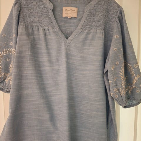 Nydelig blå flaggermus ermet fra sugar &liksom. Lett luftig topp i bomull,knyting foran .nydelige broderier, Passer både s og m .meget behagelig og luftig på kroppen. pent brukt ingen skader. Fantastisk blåfarge på den. Selges 150.-+porto ingen pruting takk.
