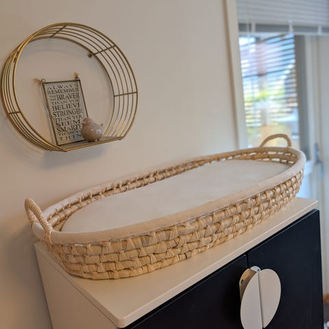 H: 52cm x Diam: 32cm. Bomull/polyester. Snor til å lukke igjen kurven. Hanker. 200kr.