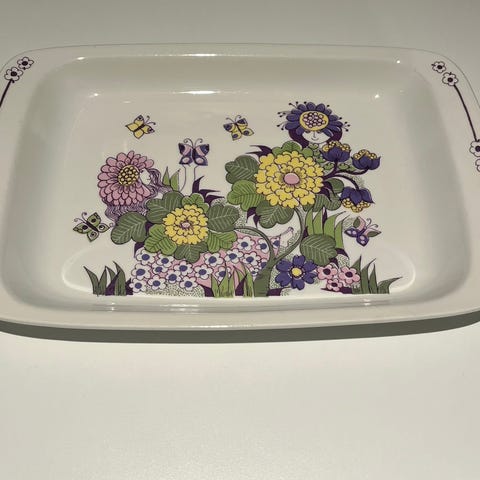 Hyggelig mønster, retro. Fatet har et lite hakk i kanten på kortsiden, ellers er delene bare pent brukt. Fabrikat er Figgjo Fajanse, og Turi Gramstad Oliver er designeren. Ble produsert ca. 1965 - 1975. Kan evt. sendes eller hentes etter avtale.