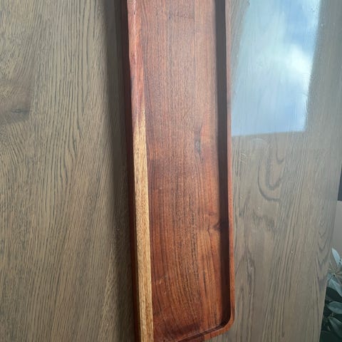 Stort fat i teak. Har utskjæringer til håndtak som er gode å holde i.