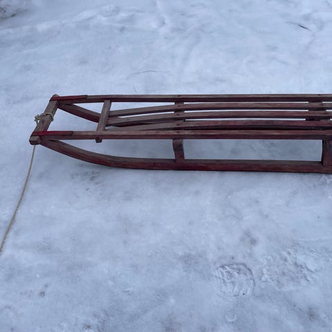 Gammel kjelke i meyall og tre. Noe medtatt, men hyggelig som dekorasjon, spesielt til jul. Lengde ca 27 cm.