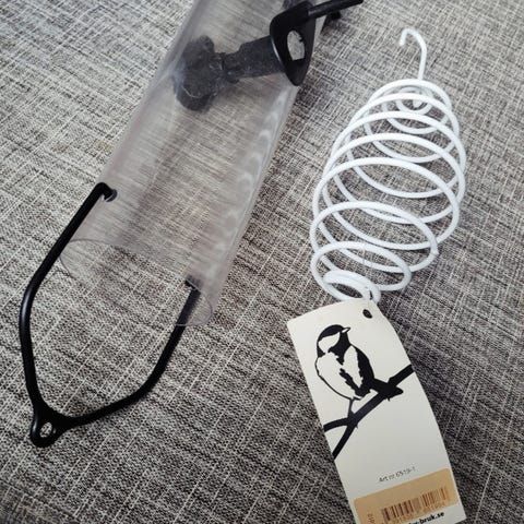 Håndverk, formet som en fugl man kan enkelt kan henge meisebolle i, på en liten krok. Pen fuglemater som pynter opp utenfor vinduet eller i et tre. Jeg sender gjerne