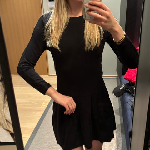 Selger veldig fin kjole i 100% merinoull fra Line of Oslo. Rett modell, noe utringet i halsen. Pent brukt, vasket etter anvisning. Selges da den dessverre har blitt for liten. Datteren på bildet er str XS/165 cm høy, kjolen er litt vid til henne.