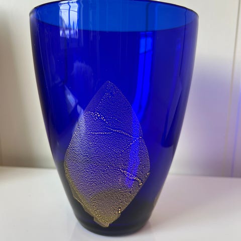 Kobolt blå vase med gulldekor. Designet av Lena Hansson for Hadeland. Høyde 19 cm.