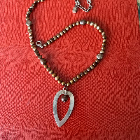 Selger et tøft og stilrent smykkesett designet av den berømte smykkedesigneren BJØRG. Settet består av et 110 cm. langt perlekjede som består av ferskvannsperler kombinert med ekte sølvperler. Perlene varierer i farge avhengig av hvilken lydkilde vi har. Noen vil kalle fargen for GUL, andre vil si at den er mer LIMEGRØNN. I begge endene er det et hjerte. I den ene enden er det et helt hjerte og så er det satt inn en ferskvannsperle på venstre side av sølvhjertet. I den andre enden er det et åpent hjerte hvor det henger en ferskvannsperle( se bildet). Smykket knyttes sammen. En kan ha perlekjeder 2 ganger rundt halsen. Smykket kan danderes på flere måter. Armbåndet har en lengde på 20 cm. Kan utvides( se bildet. Midt på armbåndet er det et åpent sølvhjerte sammen med en større perle. Smykket koster 1000kr Armbåndet koster 500kr, altså samlet kr 1500.. Nå gis det avslag på 400kr=1100kr❤️