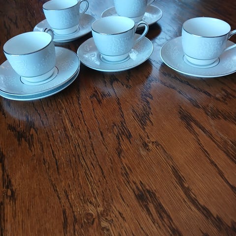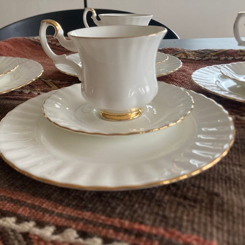 Walbrzych fra Polen. Hvitt med gullkant. Bolle 23 cm dia og 6 cm dyp. 10 tallerkener 24 cm