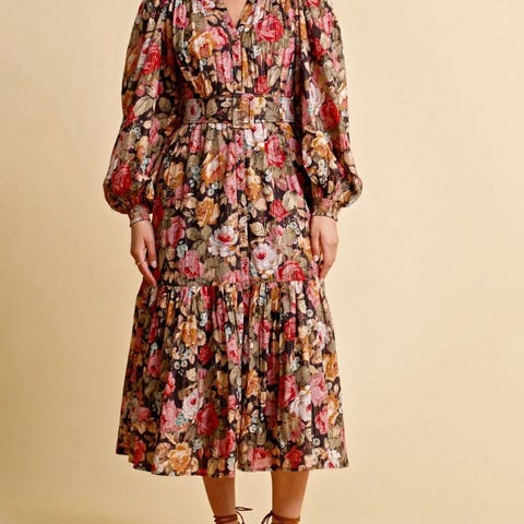 Baby Cord Midi Dress" fra ByTimo. Lekker midikjole i den populære babycord kvaliteten. Kjolen kommer i sort bunnfarge med blomsterprint i rød, orange og grønn. Den har rund hals, voluminøse ermer med rynkesøm nederst og lukkes med skjult glidelås bak. Kjolen har en rett og avslappet passform med elegant kappe nederst. Flott lengde til ca midt på leggen.