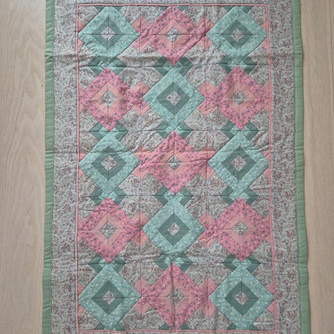 Veggteppe i brodert tekstil med to forskjellige motiver: et par i historiske klær og en kvinne som står ved en peis med en katt i nærheten. Fargene inkluderer svart, hvit, lilla, blå, rød og brun. Tekstilet har dekorative border med blomster og geometriske mønstre.