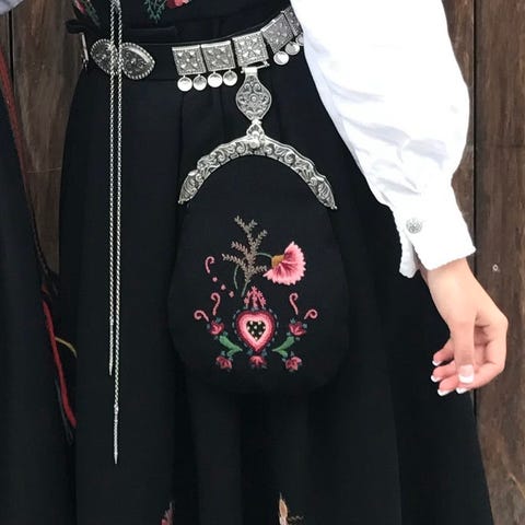Flott Ringeriksbunad med veske, skjorte, veske, sølv og evt sko til leie. Jeg har bunadsko i flere str. Størrelse small-medium: Hel lengde fra skulder og ned 140 cm, livvidde 80cm.