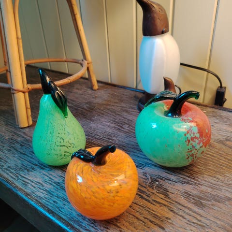 Flott glasseple 7,5cm høyt(9cm m.stilk). Dette er ikke signert, er ganske sikkert Gro Bergslien. Evnt frakt i tillegg.