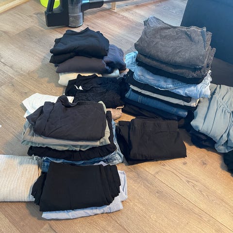 6 x Shorts, 3 x kjoler, 2 x gensere, 2 x singletter, 4 x t-skjorter, bukser.