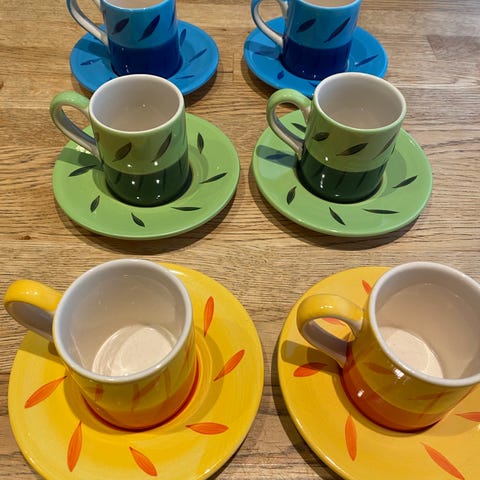 Selger tekoppservise med tre små fatt, tekopper og en mugge. 100 kr for alt. Kan sendes mot portotillegg. Ved spm ta kontakt :)