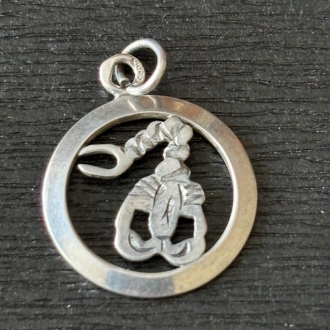 Et nydelig lite vintage anheng i sølv med motiv stjernetegnet Krepsen. Selges uten kjede, kun anheng. Stemplet 830 s