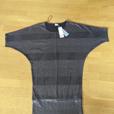 Ny kjole fra Saint Tropez. Svart med hvite prikker. Svart løs underkjole følger med. Løs i form, luftig og lett. Kan strammes rundt midjen. Normal i størrelsen (M)