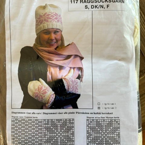 Oppskrift og 2 nøster til 1 par votter til salgs.