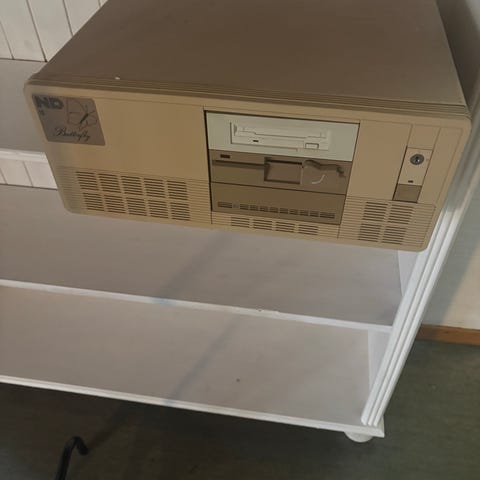 Retro pc fra 2003 med windows XP, diskettstasjon og CD-ROM