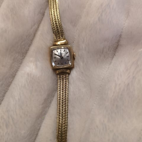 14 karat gull. Fikk den som jule gave for 4 år siden og vil selge den. Trenger batteri. Men funker veldig bra og som den skal.