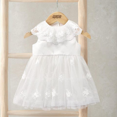 Espirit, Hvit kjole. Med Mørk Blå Sløyfebånd. Ermeløs design med rund hals. Glidelås i ryggen, samt avskjæring i midjen og mye vidde i skjørtet.