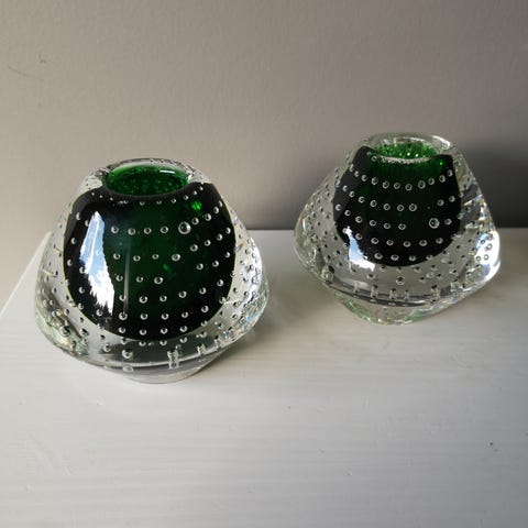Disse lysestakene passer godt til telys og som borddekorasjon. De kan stables oppi hverandre og kan også brukes som skåler. De har en behagelig grønnfarge med hvite strøk, god tyngde og god kvalitet. Lyset skinner fint igjennom og danner mønster.