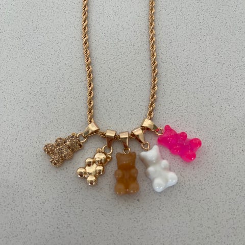 «Trendy bamseanheng i forgylt metall og besatt med rosa glitrende cubic zirkonia-stener. Kjede i forgylt sølv. De kan brukes som charms på armbånd, henges på som dekor på øreringer eller brukes som smykke. Perfekt til layering med andre smykker og kjeder. Passer for alle aldre.»