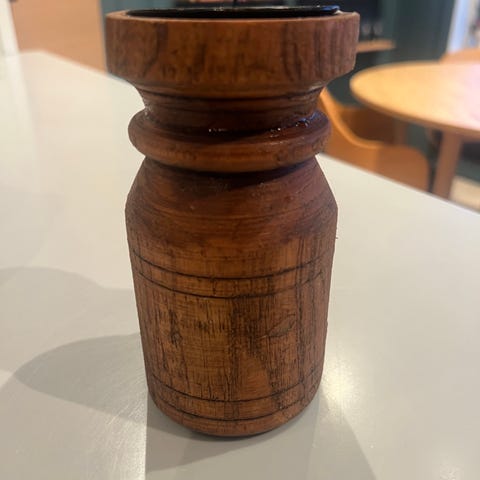 Den er 34 cm. høy, diameter nederst er 10, og øverst, 9,5 cm. Den veier 1,2 kg.