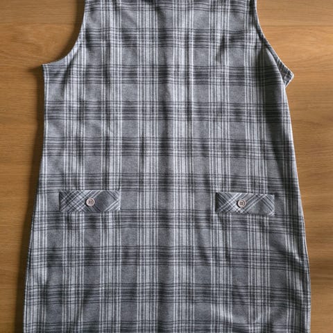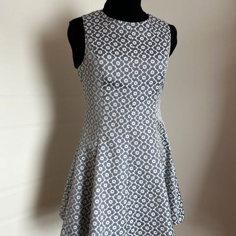 Hvit og sortmønstret kjole fra H&M. Merket med størrelse 42, men oppleves som liten i størrelsen og passer bedre om du bruker størrelse M. Omkrets bryst er 96 cm, livvidde 78 cm og lengde 90 cm. Glidelås i ryggen, hemper for belte (medfølger ikke-disse kan evt fjernes da den er like fin uten). Laget av 90% bomull og 10% polyester, innvendig fôr av polyester. Pent brukt uten flekker eller skader.