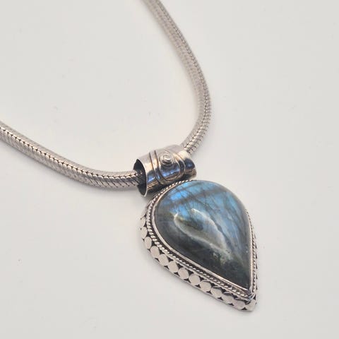 Håndlaget halssmykke i ekte sølv, labradoritt halvedelsten