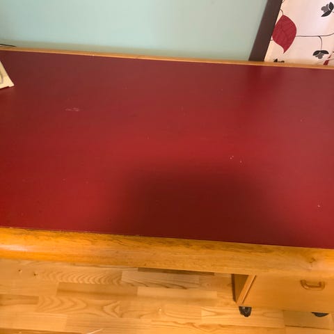 Gammeldags pult med oppbevaring under bordplaten, og senke/heve mulighet.