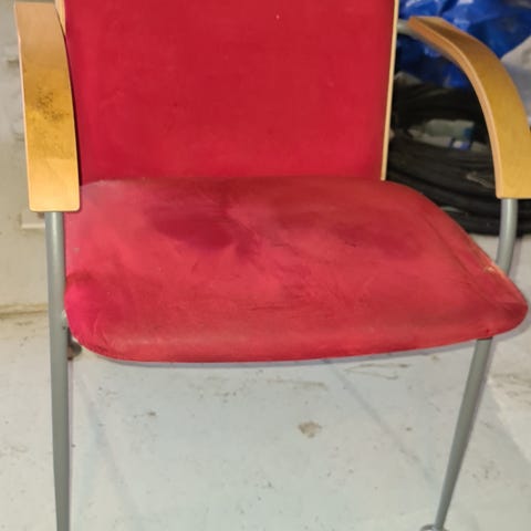 Kvalitetsstoler med tre og metallramme og med fin rødfarge på polstring sete og rygg,