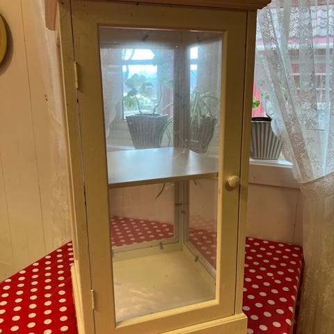 Dette vakre, lille skapet i tre, med glassvinduer vil ta seg fint ut så mange plasser i et hjem. To glasshyller inni, hvor høyden kan reguleres. Fint til pene glass/serviser, eller for eksempel som skap til parfymeflasker. Hentes hos meg i Kristiansand. (Tar ikke sjansen på å sende det med post.)