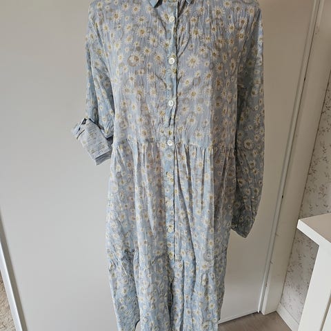 Nydelig blåfarge, vanskelig å fange.. viscose så faller fint. Dette er kjolen som skjuler det meste…. God vidde