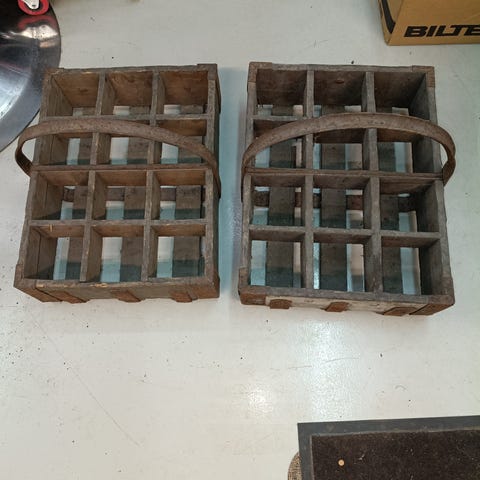Beholder til flasker etc. Malt motiv. Ubestemmelig alder. Nydelig. Høyde 25 cm. Bunn 25x17 cm. Rom til flasker målt innvendig 7x7 cm.