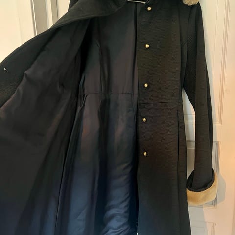 Ukjent alder, pen modell. Mørkeblå og brune detaljer. En knapp foran. I god stand men trenger en rens. Innvendig lomme må syes fast i den ene siden.