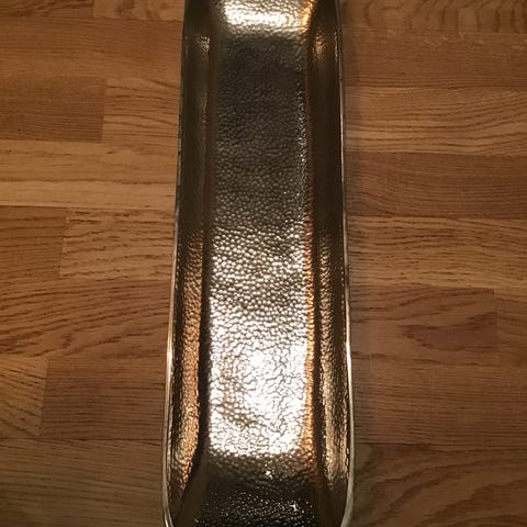 Gave? Gammelt, håndlaget fat i tinn selges kun kr. 300,-. Signert. Lengde 24 cm. Bredde 13 cm. Høyde 4 cm. Dekorativt. Meget pent. Sjeldent.