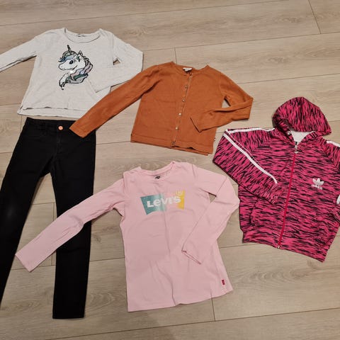 T-skjorte står 14 år men tilsvarer mye mindre, tightsen står 146/152 men lite i str, vil si det passer 10-11år.