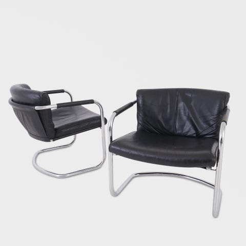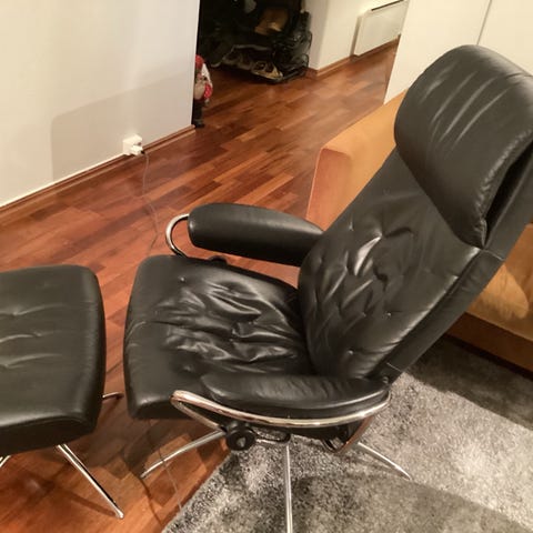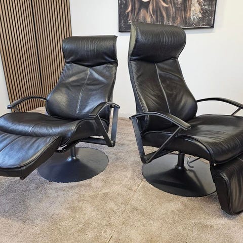 Lekker svingbar og slank hvilestol i skinn med tilhørende puff/skammel fra svenske Ire.