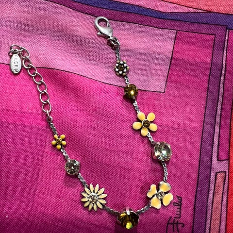 Armbåndet er et Pilgrim-smykke, et dansk merke kjent for sine håndlagde smykker og bruk av fargerike krystaller. Det er dekorert med fasetterte krystallsteiner i flere farger, holdt sammen av en metalllenke med en karabinkrok-lås og en liten logoplate.