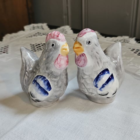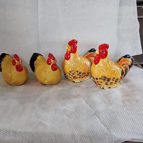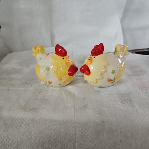 Mål 10 x 7 cm hanen og høna er 7 x 7 cm. Fremstår som flott.