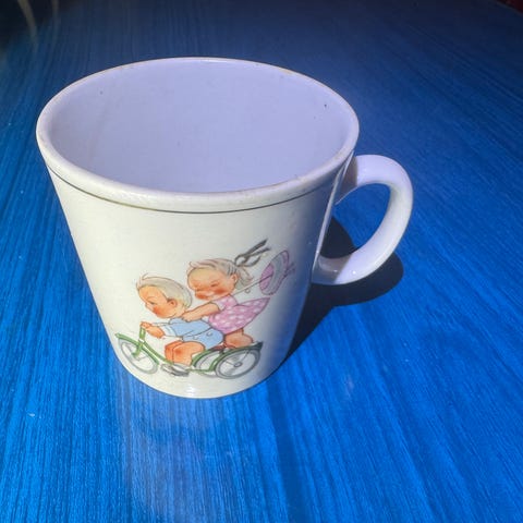 Barneservice i porselen selges for kr. 300. Det består av 6 kopper med tefat, 6 små teskjeer, 1 kanne og en sukkerkopp. Koppene er 6,5 cm i diameter og 5,5 cm høye. Ingen nage eller krakkeleringer.