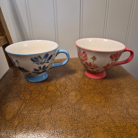 3 tekopper, skål og asjetter, Diameter på kopp 10,5 cm En ekstra asjett følger med. Kr 90,-.
