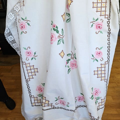 Meget pen duk i lin og med korstingsbroderi. Kantet med blonder. 140 cn ×130 cm Et nydelig håndarbeide. Meget pen, vasket, strøket og uten feil og mangler. Stasduk. Samsender gjerne med mine andre annonser.